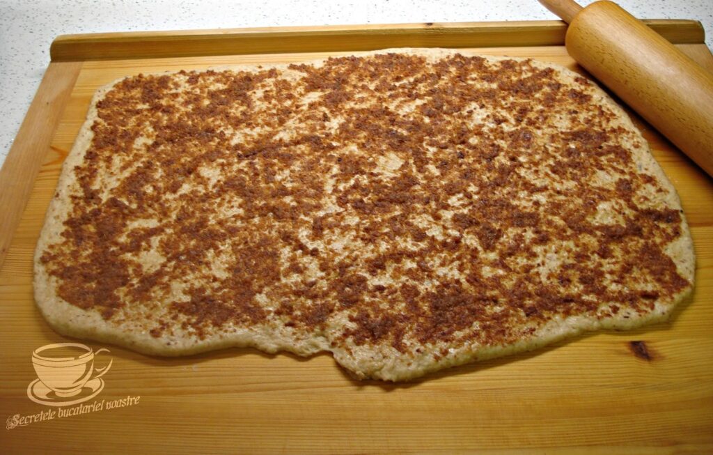 După dospire întindem aluatul pe suprafața de lucru în foaie groasă de 1 cm.