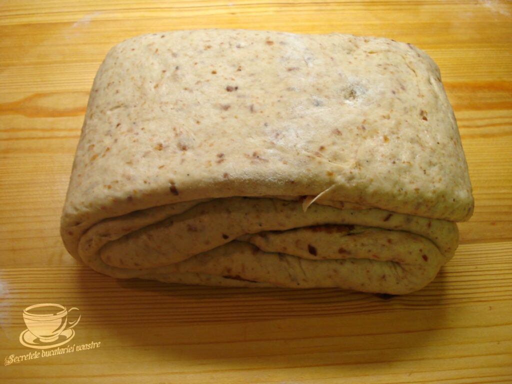 Împăturim aluatul  obținut încă o dată, ca mai sus, și îl acoperim. Lăsăm la dospit încă 20 de minute.