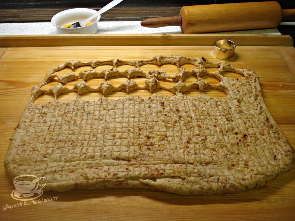 Aluatul dospit îl întindem pe suprafața de lucru în foaie groasă de 1,5 cm. Cu ajutorul unui cuțit ascuțit vom cresta sub formă de grilaj întreaga suprafață a aluatului.