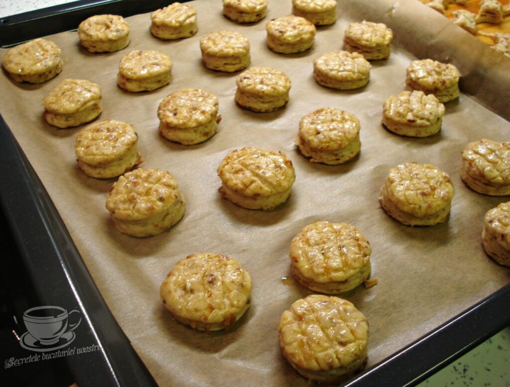 Le așezăm în tava tapetată cu hârtie de copt si le ungem la suprafață cu ou bătut. Le coacem în cuptorul încins la 190°C pentru 20-26 minute, până se rumenesc la suprafață.